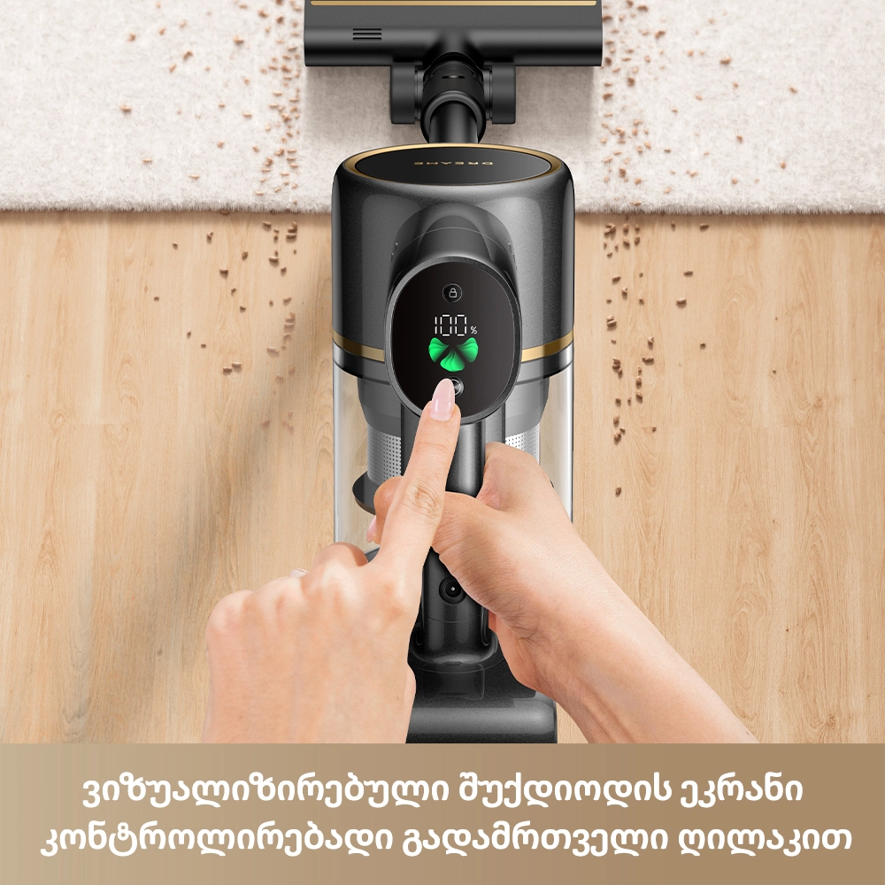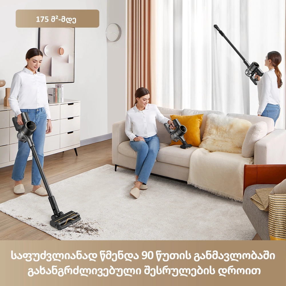 - 1.5 საათამდე მუშაობა — იდეალურია დიდი ფართის მქონე ბინების სრულად დასასუფთავებლად.
