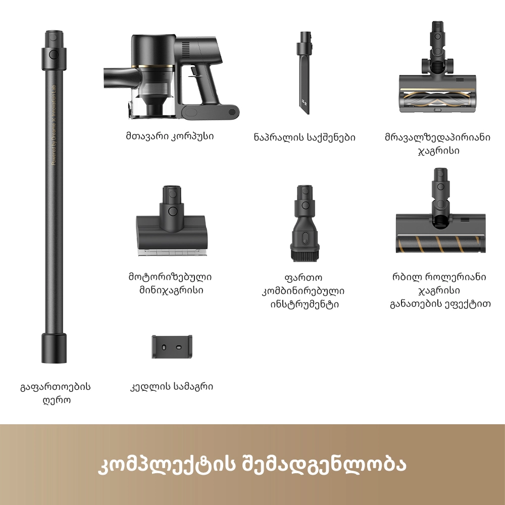 - მრავალფუნქციური საცმების კომპლექტი — სხვადასხვა აქსესუარი სახლის ყველა კუთხის სრულყოფილი წმენდისთვის.